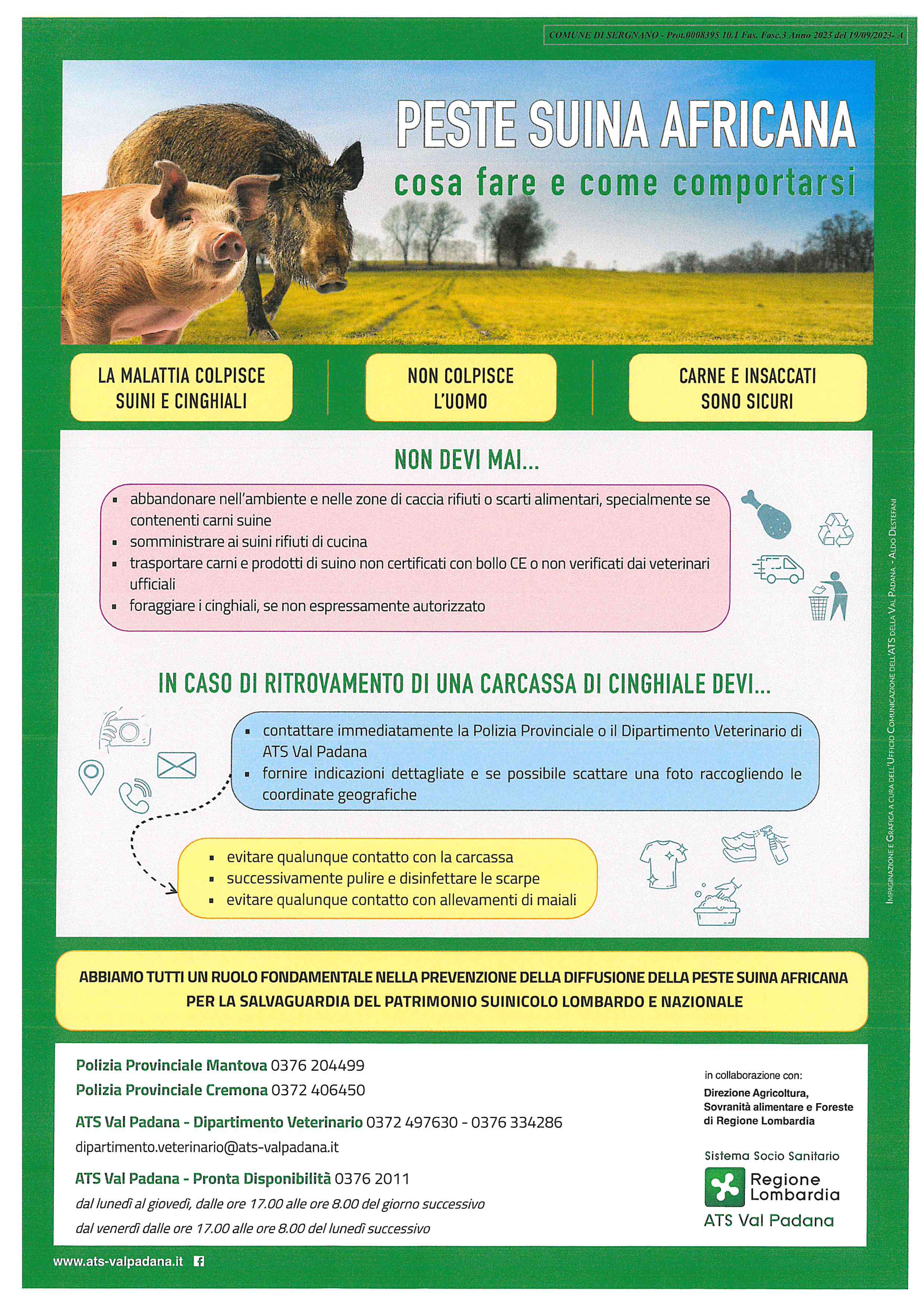 Per evitare la proliferazione dell'epidemia tra suini e cinghiali è vietato abbandonare nell'ambiente rifiuti alimentari, somministrare ai suini scarti di cucina, foraggiare i cinghiali e trasportare carni o prodotti di suino non certificati. Nel caso di ritrovamento di una carcassa di cinghiale o suino è necessario avvisare subito la Polizia Provinciale al numero tel. 0372.406450 o il Dipartimento veterinario di ATS Valpadana al numero tel. 0372.497630 - dipartimento.veterinario@ats-valpadana.it
