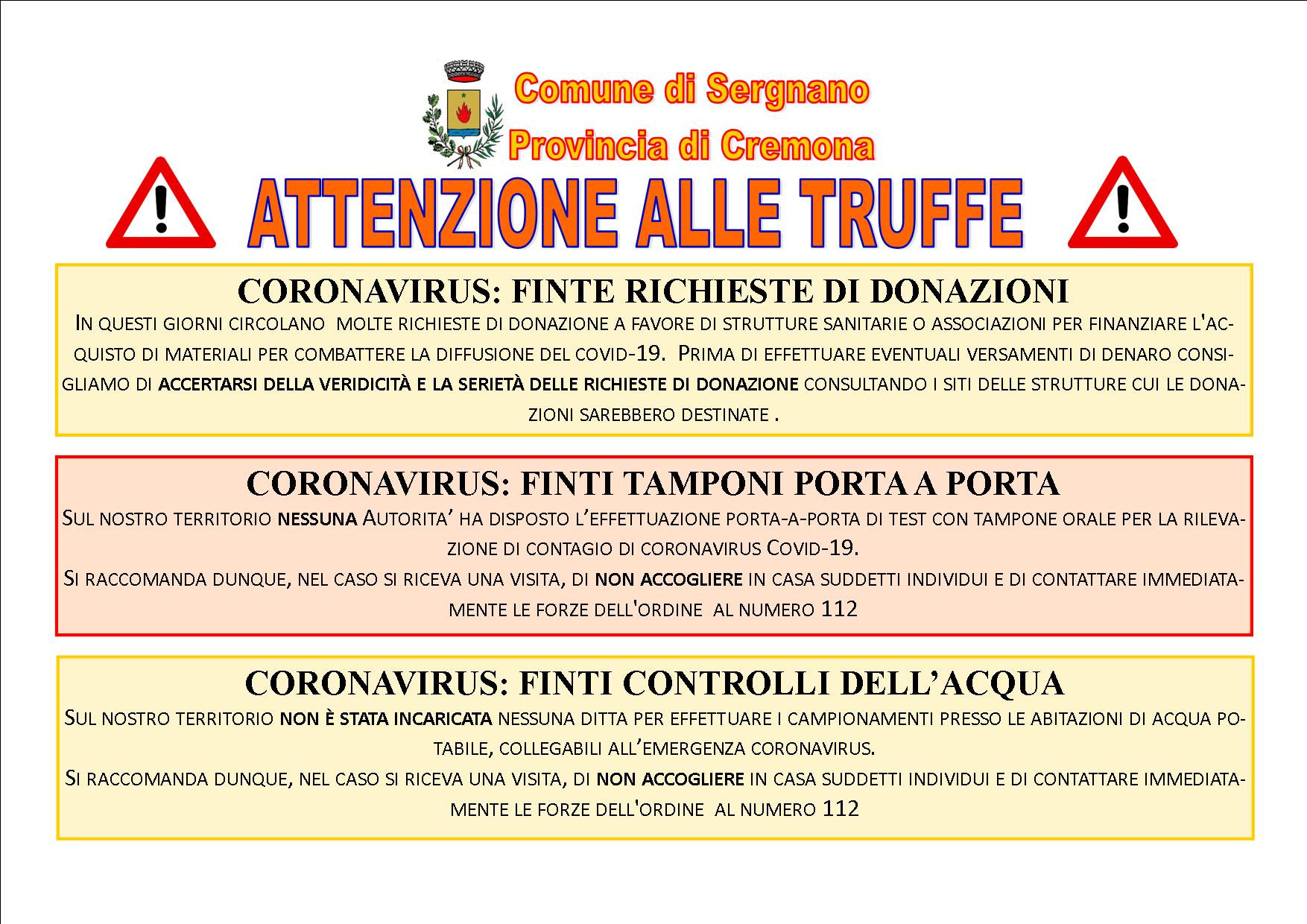 Si avvisa la cittadinanza di prestare la massima attenzione rispetto a possibili truffe circa la richiesta di donazioni economiche, finti tamponi porta a porta, finti incaricati del controllo di acqua o gas, finte consegne porta a porta di mascherine o altro materiale. Massima attenzione anche per le truffe online, richieste dati o e-mail sospette, diffusione di false informazioni via internet o social network.