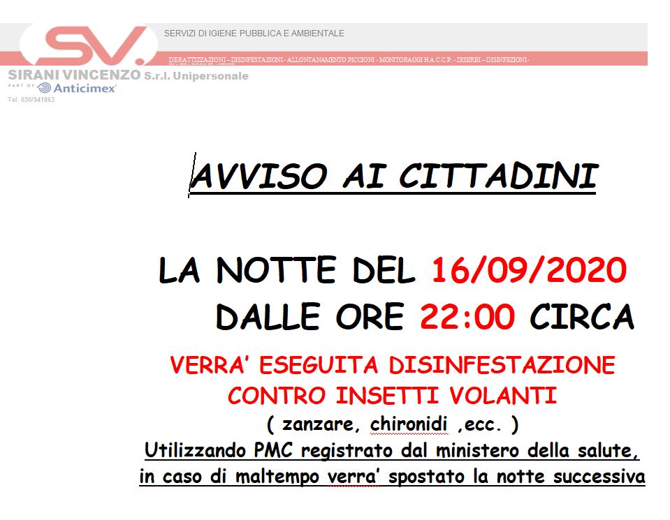 Si avvisa la cittadinanza che nella notte di mercoledì 16.09.2020 dalle ore 22.00 verrà eseguita, da apposita ditta specializzata, una disinfestazione contro insetti volanti (zanzare, chironidi etc.) nel territorio comunale di Sergnano. In caso di maltempo la disinfestazione verrà eseguita la notte successiva.