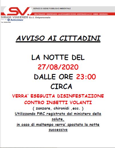 Si avvisa la cittadinanza che nella notte di giovedì 27.08.2020 dalle ore 23.00 verrà eseguita, da apposita ditta specializzata, una disinfestazione contro insetti volanti (zanzare, chironidi etc.) nel territorio comunale di Sergnano. In caso di maltempo la disinfestazione verrà eseguita la notte successiva.