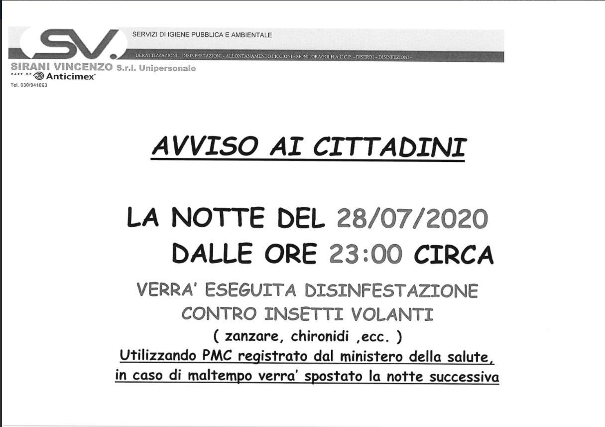Si avvisa la cittadinanza che nella notte di martedì 28.07.2020 dalle ore 23.00 verrà eseguita, da apposita ditta specializzata, una disinfestazione contro insetti volanti (zanzare, chironidi etc.) nel territorio comunale di Sergnano. In caso di maltempo, la disifentaszione verrà eseguita la notte successiva
