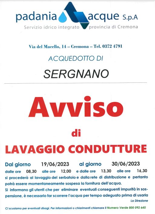 L'Amministrazione Comunale avvisa la cittadinanza che dal giorno 19.06.2023 al 30.06.2023 dalle ore 08.30 alle 12.00 e dalle ore 13.30 alle 16.30 la società Padania Acque Spa procederà al lavaggio del serbatoio e della rete di distribuzione idrica nel Comune di Sergnano. Negi giorni ed orari indicati potranno quindi verificarsi sospensioni momentanee della fornitura di acqua.