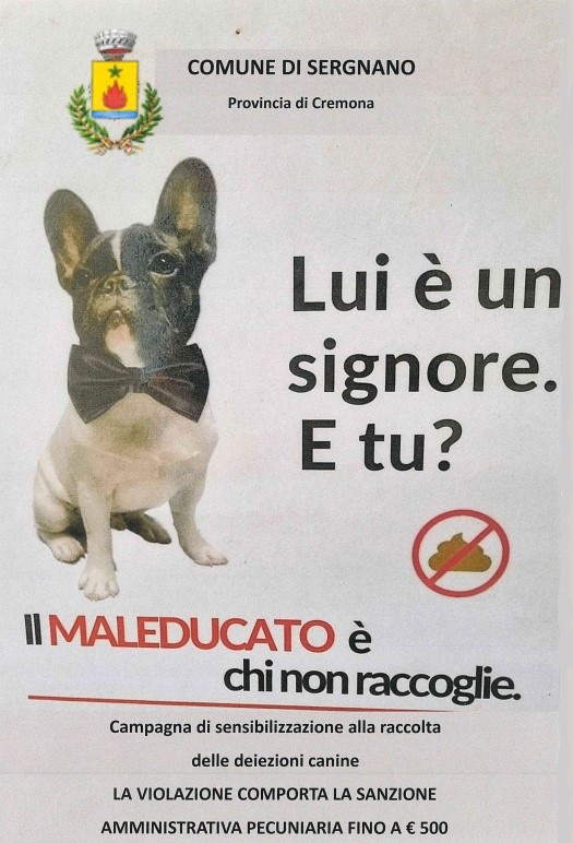L'Amministrazione Comunale ha avviato una campagna di sensibilizzazione sul decoro urbano e l'igiene pubblica, con l'esposizione di avvisi e manifesti che hanno lo scopo di sollecitare i proprietari di cani a raccogliere le deiezioni dei propri animali, soprattutto nelle aree verdi e parchi pubblici dove è consentito loro l'accesso.