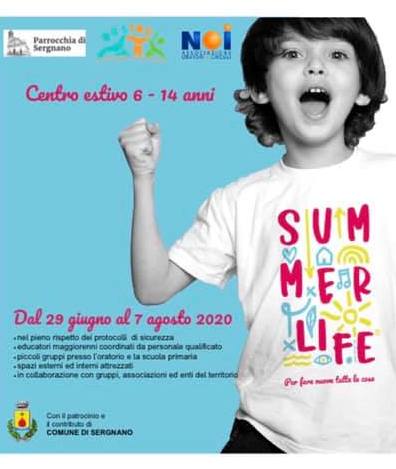 L'Oratorio parrocchiale, con il contributo del Comune di Sergnano, organizza un centro estivo per i ragazzi dai 6 ai 14 anni dal 29 giugno al 7 agosto 2020. La proposta "Summerlife" vuole continuare ad accompagnare i ragazzi nel periodo estivo, dare un sostegno alle famiglie in accordo con tutte le normative vigenti. La proposta è rivolta ai ragazzi: