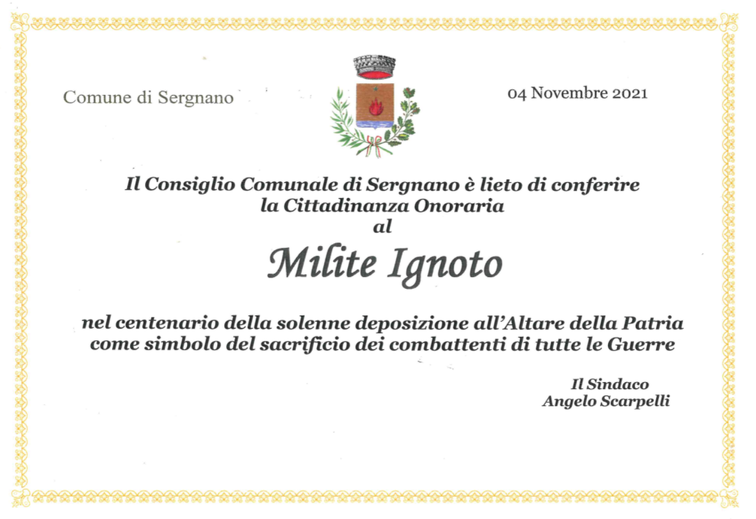 Il Consiglio Comunale di Sergnano ha conferito all'unanimità la cittadinanza onoraria al Milite Ignoto in occasione del centenario della solenne deposizione all'Altare della Patria, come simbolo del sacrificio dei combattenti di tutte le guerre.