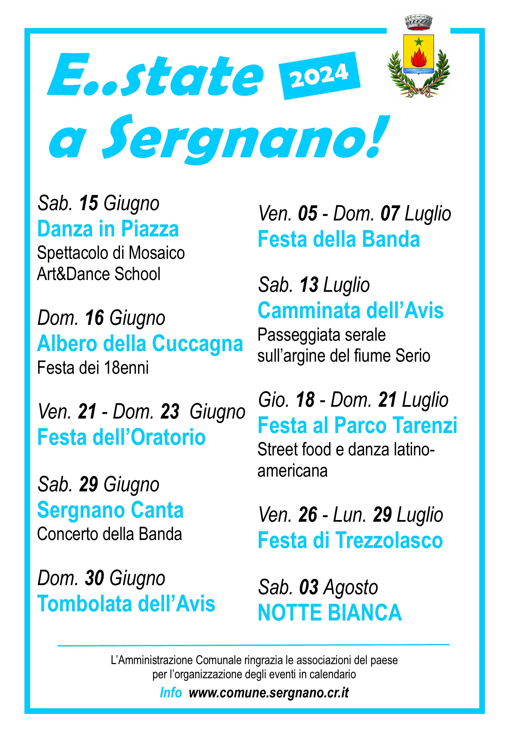 L'Amministrazione Comunale ha raccolto in un unico calendario le principali manifestazioni che si terranno nel periodo estivo in paese. Il Comune di Sergnano ringrazia tutte le associazioni locali per l’organizzazione delle iniziative in programma.