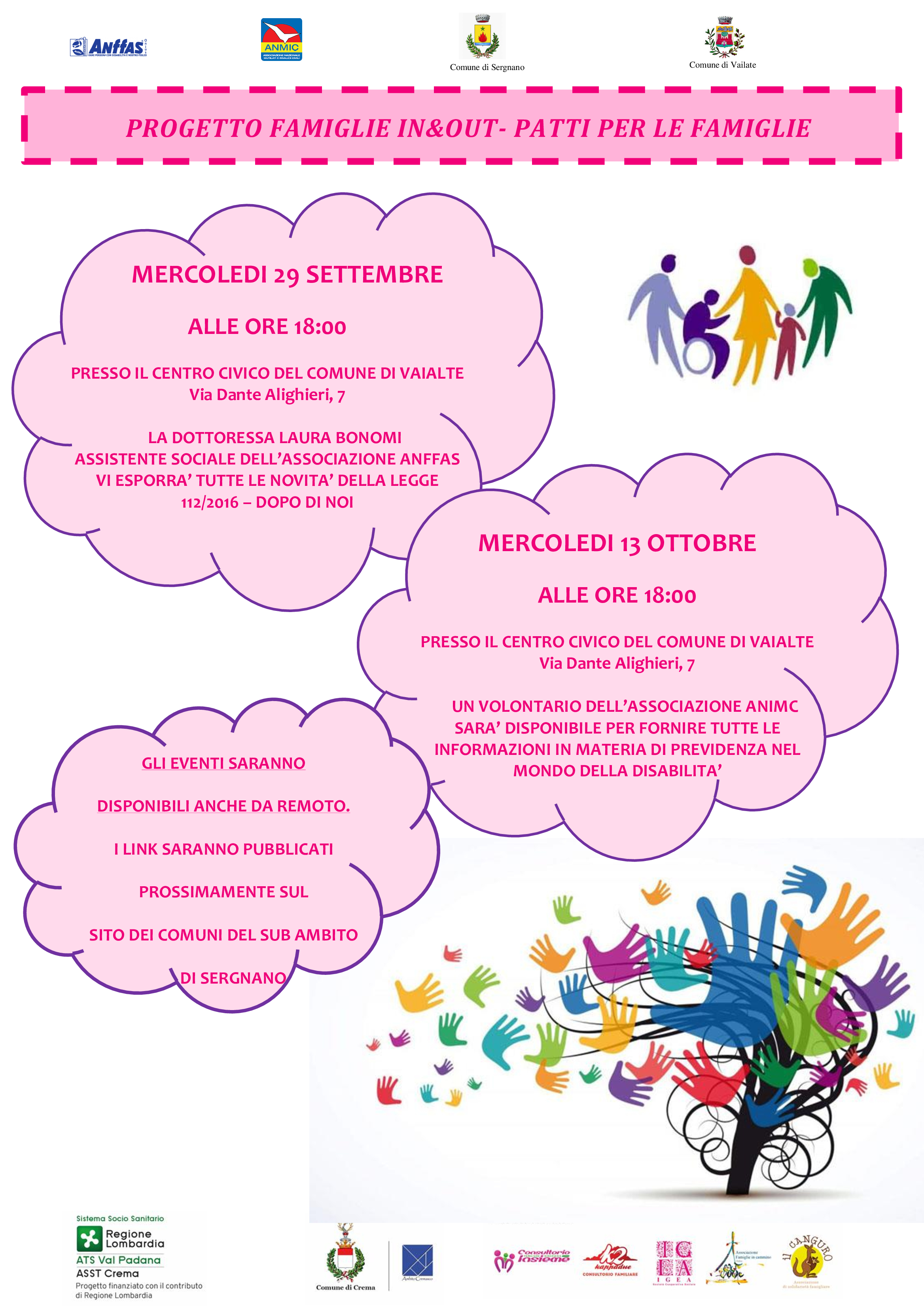 Il sub ambito di Sergnano organizza due momenti informativi previsti dal progetto "Famiglie In&Out ", finanziato da Regione Lombardia. Gli incontri si terranno presso il Centro Civico di Vailate (Via S. Giani, 8) ma saranno anche disponibili con connessione online da remoto per chi non potesse partecipare “in presenza” (link disponibile a breve)