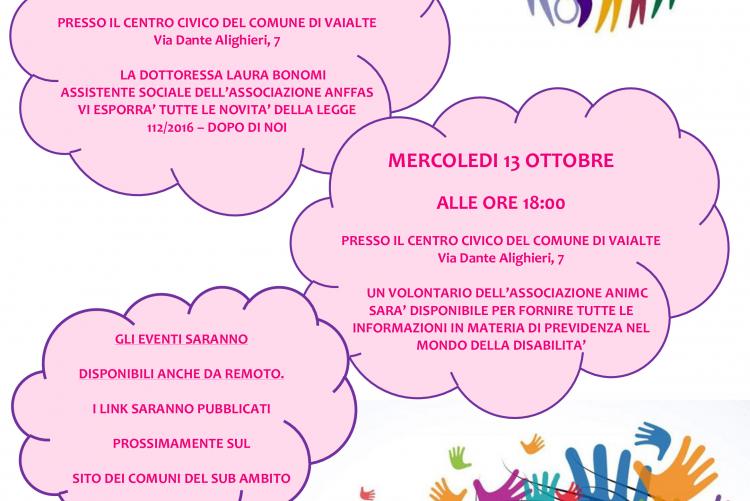 Nel primo appuntamento (previsto in data 29.09.2021 alle ore 18.00) l’AS Bonomi di ANFFAS spiegherà i contenuti della legge "Dopo di Noi" ideata per le persone con disabilità, mentre nel secondo incontro (previsto in data 13.10.2021 alle ore 18.00) un volontario dell’ANMIC fornirà tutta una serie di informazioni in materia di previdenza sempre nel mondo della disabilità.