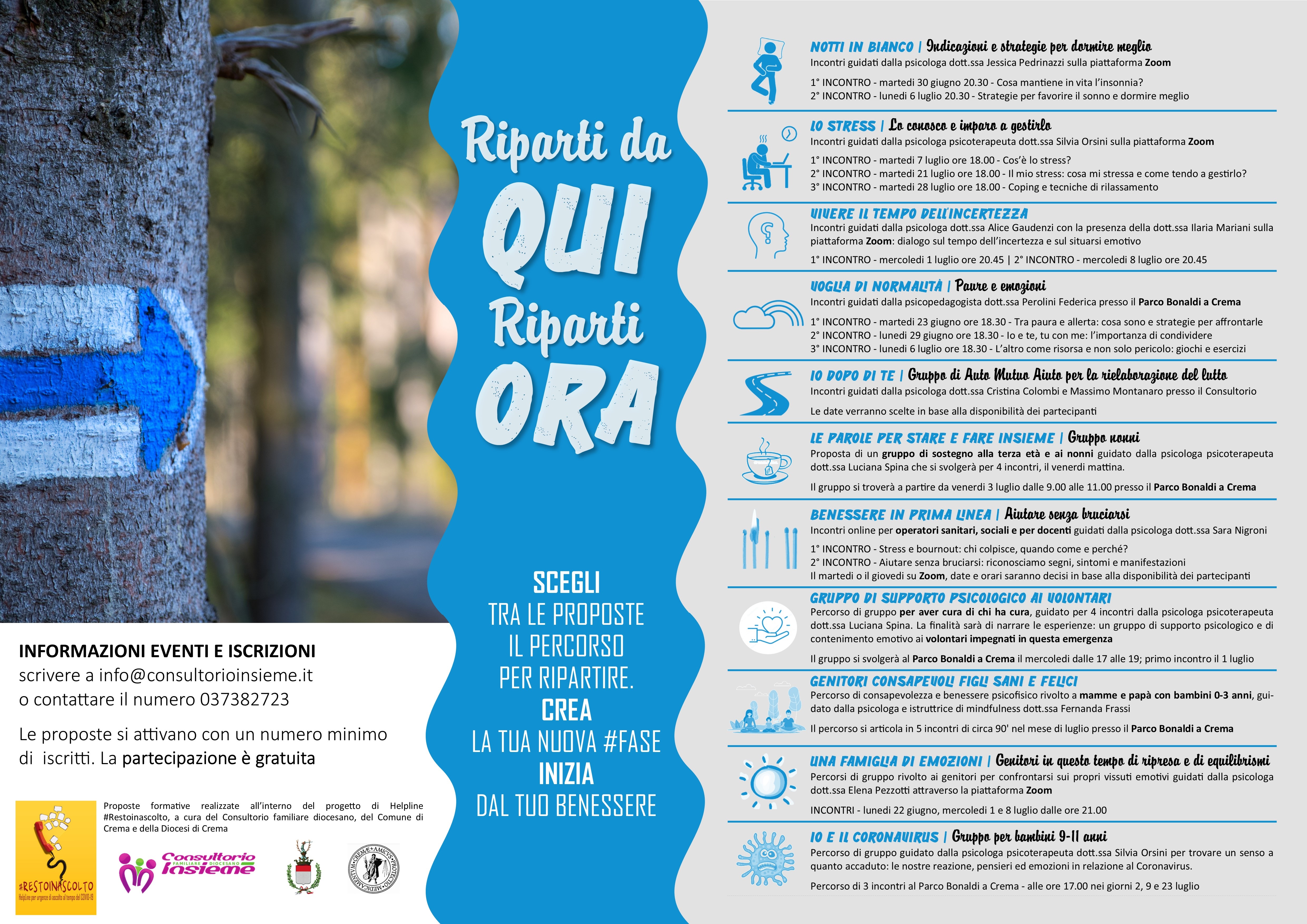 Il Consultorio familiare diocesano, in collaborazione con il Comune di Crema e la Comunità Sociale Cremasca, ha quindi valutato (insieme alle psicologhe che hanno collaborato alla Helpline) alcuni percorsi in presenza e online con varie tematiche, rivolti a diverse tipologie di persone e di età (adulti, bambini e ragazzi, anziani) e ruoli (genitori, nonni, volontari). #RIPARTIdaquiRIPARTIora propone diversi percorsi di benessere, ognuno può scegliere il suo. Tutte le proposte sono gratuite e partiranno solo al raggiungimento di un numero minimo di iscritti. Per informazioni su eventi ed iscrizioni è possibile inviare una mail all’indirizzo di posta elettronica info@consultorioinsieme.it o contattare il numero tel. 0373/82723. La partecipazione è gratuita.