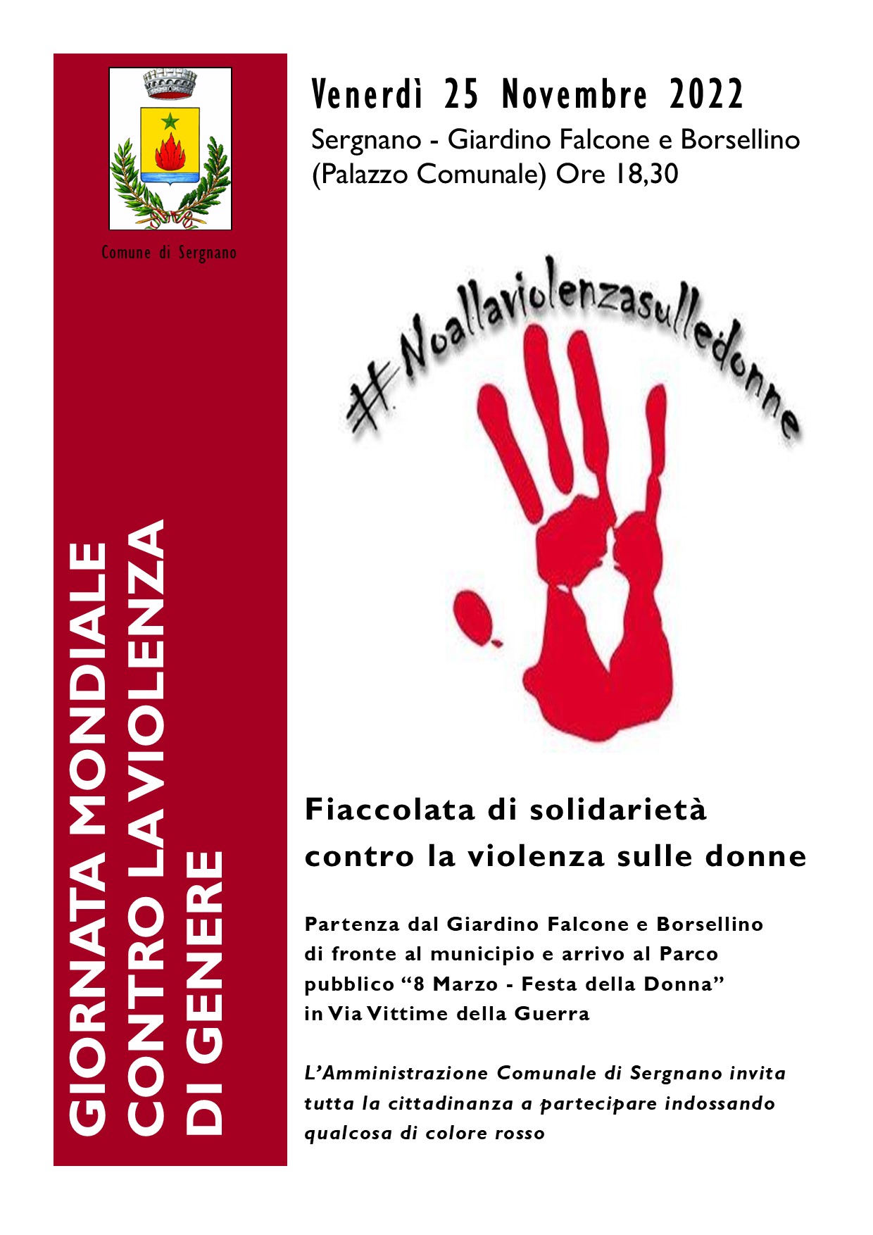 In occasione della "Giornata internazionale per l'eliminazione della violenza di genere" l'Amministrazione Comunale promuove una fiaccolata di solidarietà contro la violenza sulle donne. Partenza alle ore 18.30 di venerdì 25 novembre 2022 presso il Giardino Falcone e Borsellino (di fronte al municipio) e arrivo al parco pubblico "8 Marzo - Festa della Donna" in Via Vittime della Guerra. Si invita la cittadinanza a partecipare indossando qualcosa di colore rosso.
