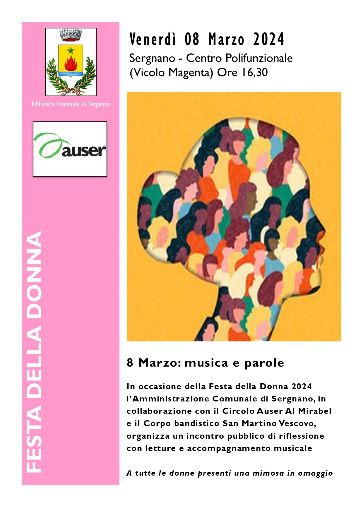 In occasione della Festa della Donna l’Amministrazione Comunale di Sergnano, in collaborazione con il Circolo Auser Al Mirabel e il Corpo bandistico San Martino Vescovo, organizza un incontro pubblico di riflessione con letture e accompagnamento musicale. Appuntamento per la giornata di venerdì 08 marzo 2024 alle ore 16,30 presso il Centro Polifunzionale di Vicolo Magenta.