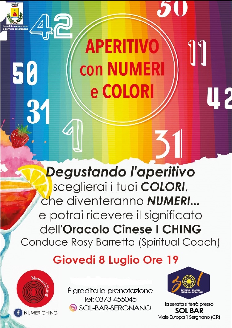 Giovedì 8 luglio 2021 alle ore 19.00 appuntamento con l'iniziativa "Aperitivo con numeri e colori". Evento organizzato dal Bar Sol e "Numeri Ching" in collaborazione con la Biblioteca comunale di Sergnano.
