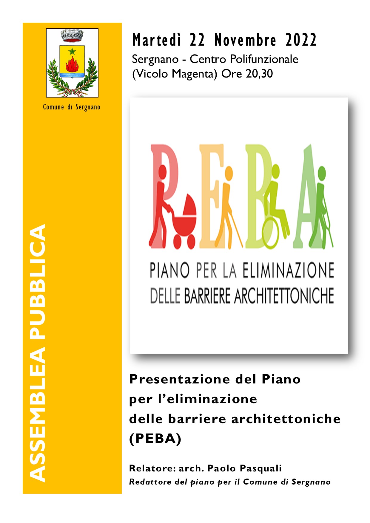 L'Amministrazione Comunale organizza l'assemblea pubblica per la presentazione del Piano per l'eliminazione delle barriere architettoniche con la presenza dell'arch. Paolo Pasquali (redattore del piano per il Comune di Sergnano). Appuntamento per martedì 22 novembre 2022 alle ore 20.30 presso il centro polifunzionale di Vicolo Magenta