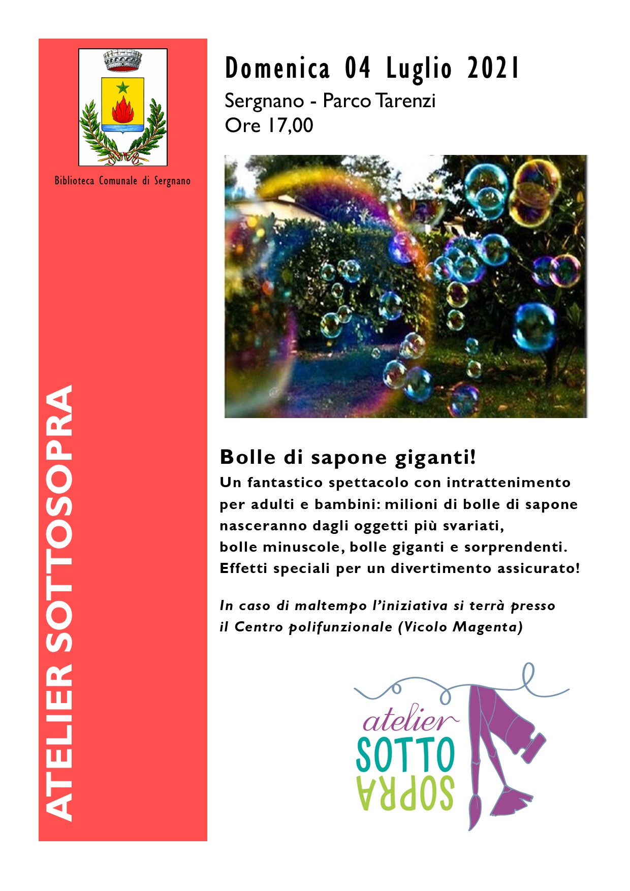 Domenica 4 luglio 2021 appuntamento al Parco Tarenzi (ore 17.00) per un fantastico spettacolo con intrattenimento per adulti e bambini: milioni di bolle di sapone nasceranno dagli oggetti più svariati, bolle minuscole, bolle giganti e sorprendenti. Effetti speciali per un divertimento assicurato!