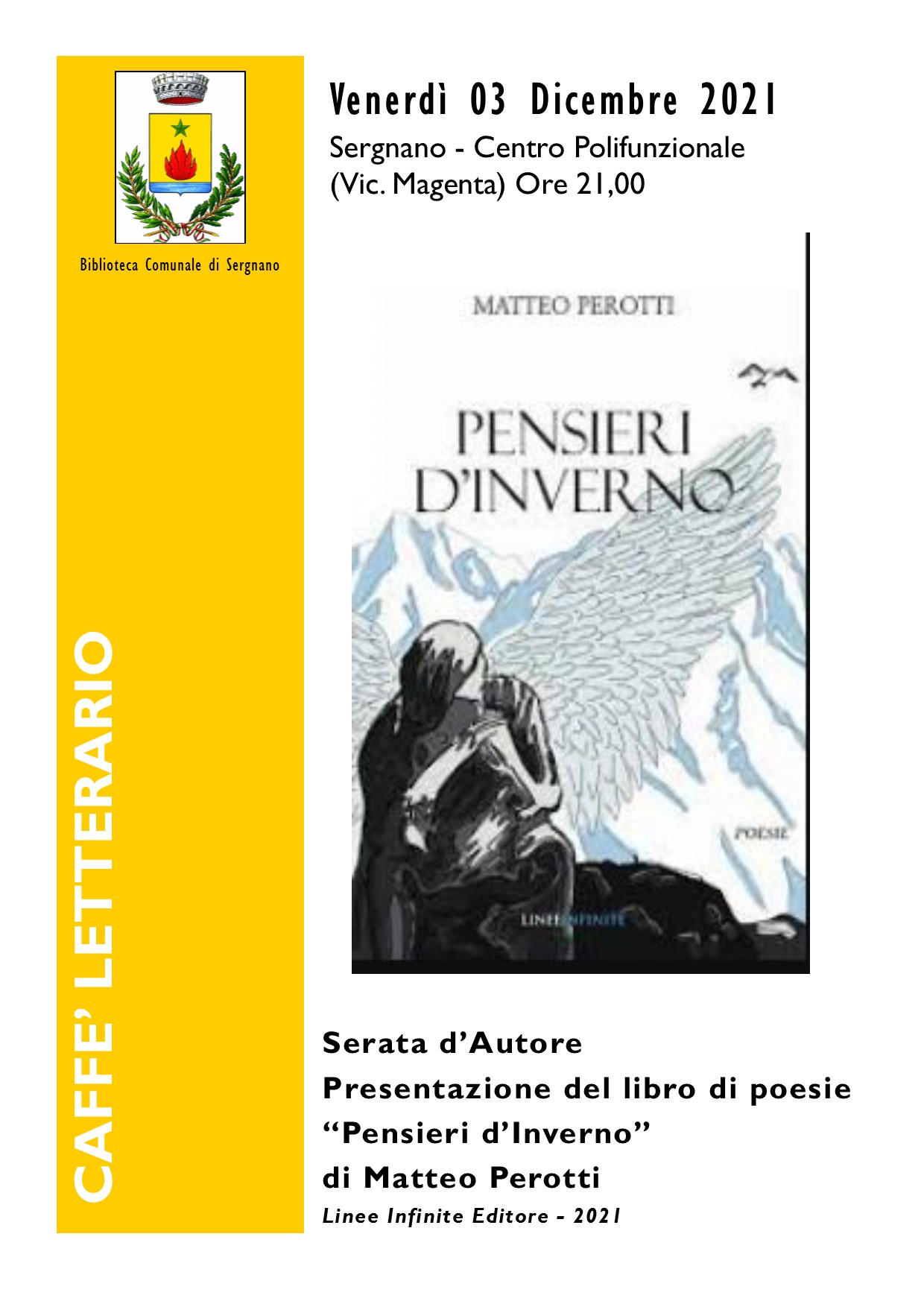 Nell'ambito della rassegna "Natale a Sergnano 2021" la Commissione Cultura organizza la presentazione del libro di poesie "Pensieri d'Inverno" di Matteo Perotti - Linee Infinite Editore. Appuntamento venerdì 3 dicembre 2021 alle ore 21.00 presso il bar del Centro Polifunzionale (Vicolo Magenta).