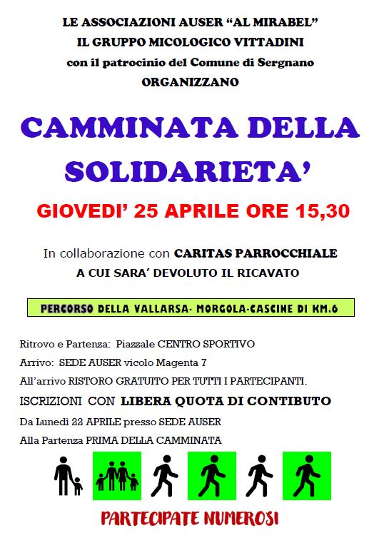 Il circolo Auser "Al Mirabel" e il Gruppo micologico Vittadini, con il patrocinio del Comune di Sergnano, organizzano una camminata di solidarietà in collaborazione con la Caritas parrocchiale, a cui sarà devoluto il ricavato. Appuntamento per la giornata di giovedì 25 aprile 2024 con ritrovo e partenza alle ore 15.30 presso il piazzale del centro sportivo di Sergnano.