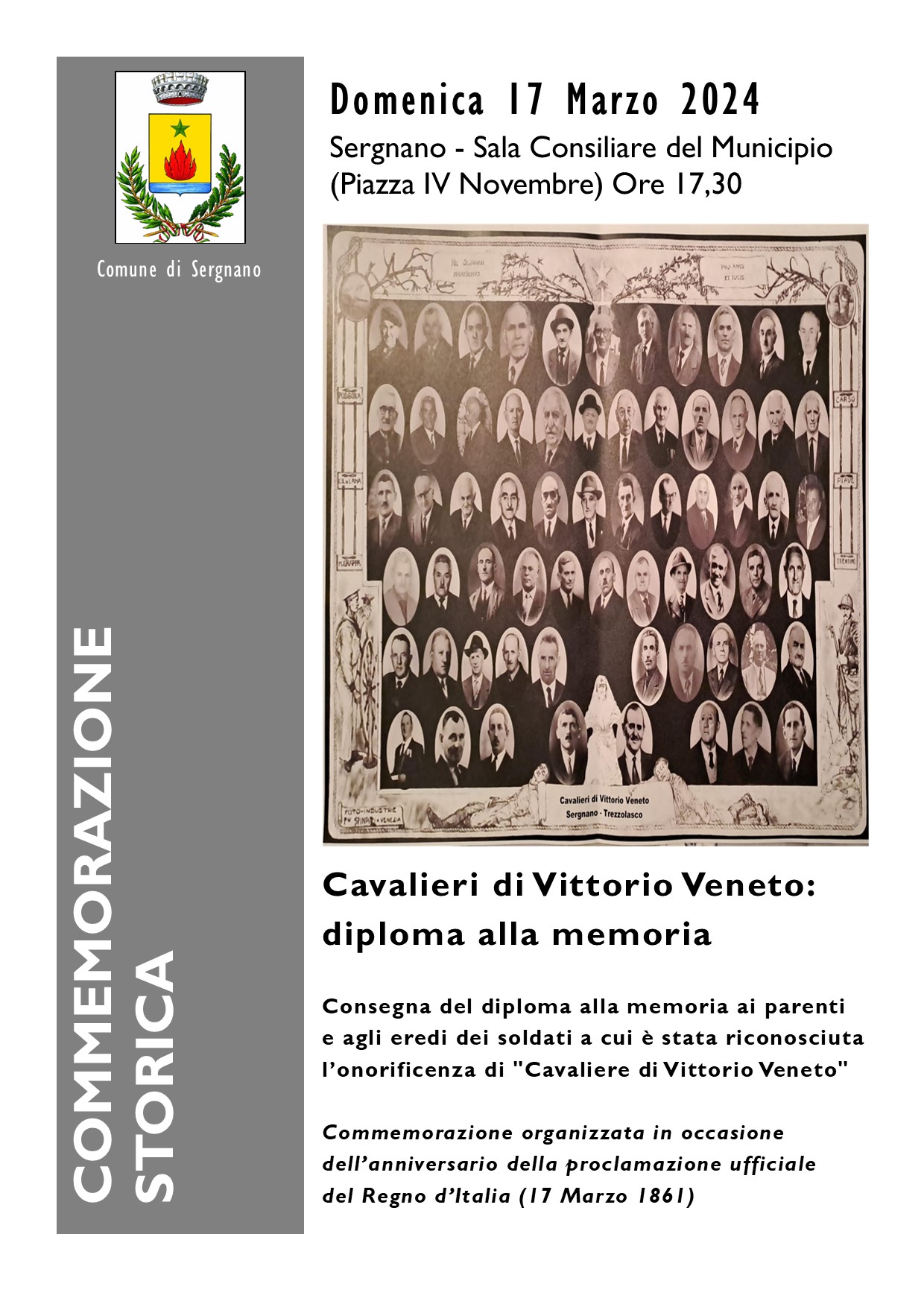 L'Amministrazione Comunale di Sergnano consegna il diploma alla memoria ai parenti e agli eredi dei soldati a cui è stata riconosciuta l’onorificenza di "Cavaliere di Vittorio Veneto". Appuntamento per la giornata di domenica 17 marzo 2024, data in cui ricorre l'anniversario della proclamazione del Regno d'Italia, alle ore 17.30 presso la Sala Consiliare del Municipio.