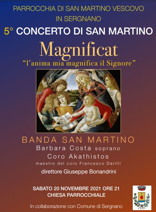 Il Corpo bandistico S. Martino Vescovo, in collaborazione con l'Amministrazione Comunale e la parrocchia di Sergnano, organizza il 5° Concerto di S. Martino: "Magnificat: l'anima mia magnifica il Signore". Partecipano: Barbara Costa (soprano) e il Coro Akatistos (guidato dal maestro Francesco Darilli). Direttore d'orchestra: Giuseppe Bonardini. Appuntamento sabato 20 novembre 2021 alle ore 21.00 presso la chiesa parrocchiale di Sergnano.