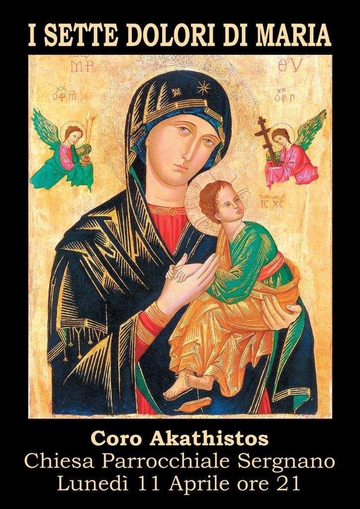 In occasione della settimana santa il Coro Akathistos organizza un concerto dal titolo "I sette dolori di Maria". Appuntamento lunedì 11 aprile 2022 alle ore 21,00 presso la chiesa parrocchiale di Sergnano.