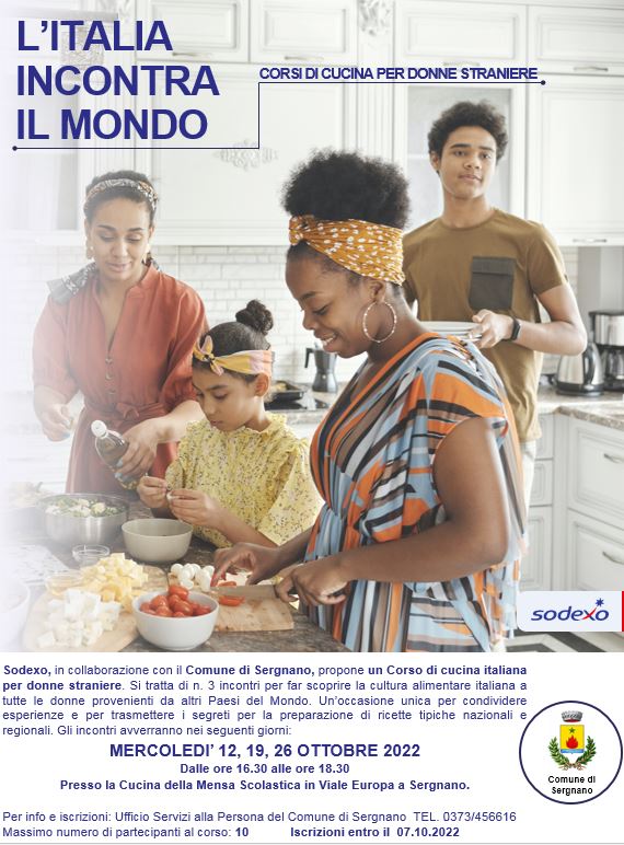 La società Sodexò, in collaborazione con il Comune di Sergnano, propone un corso di cucina italiana per donne straniere. Si tratta di n°3 incontri per far scoprire la cultura alimentare italiana a tutte le donne provenienti da altri Paesi del Mondo. Un’occasione unica per condividere esperienze e per trasmettere i segreti per la preparazione di ricette tipiche nazionali e regionali.
