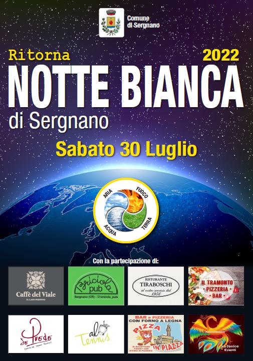 Sabato 30 luglio 2022 torna la Notte Bianca di Sergnano con bar e punti ristoro, street food, musica live e djset, mercatino con prodotti artigianali e spazi per le associazioni, area giochi per bambini e animazioni a tema