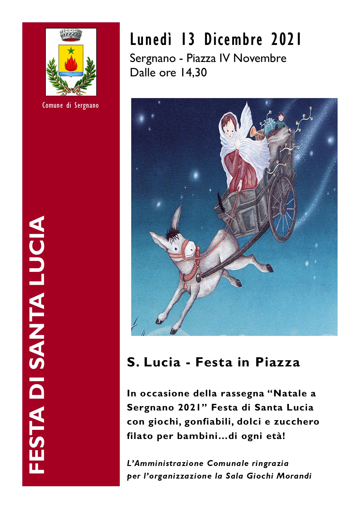 In occasione della rassegna “Natale a Sergnano 2021” l’Amministrazione Comunale organizza la Festa di S. Lucia con giochi, gonfiabili, dolci e zucchero filato per bambini…di ogni età! Appuntamento lunedì 13 dicembre 2021 a partire dalle ore 14.00 in Piazza IV Novembre.
