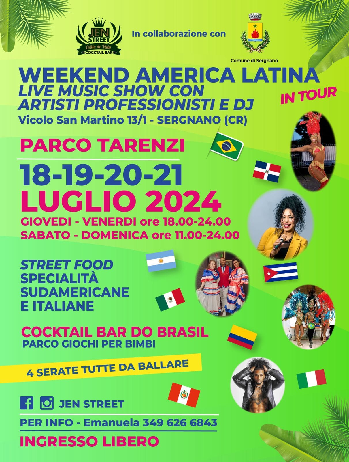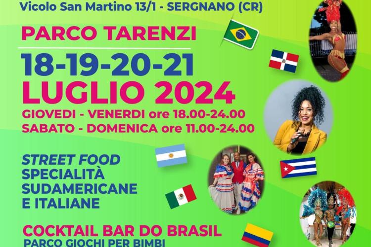 Da giovedì 18 a domenica 21 luglio 2024 presso il Parco Tarenzi è previsto il "Weekend America Latina": quattro serate con diverse iniziative, street food e animazioni musicali