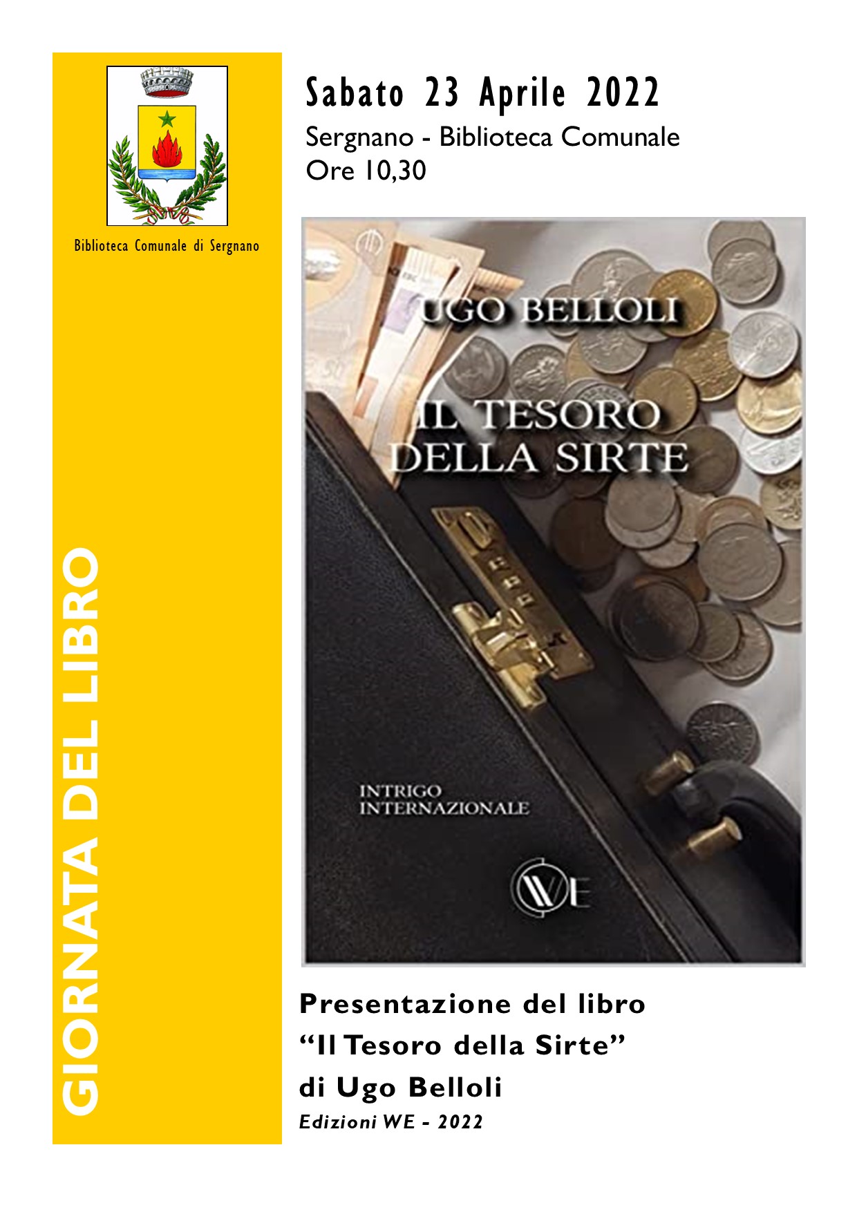 In occasione della "Giornata del Libro 2022” la Commissione Cultura e Tempo Libero organizza la presentazione del romanzo “Il Tesoro della Sirte: intrigo internazionale” di Ugo Belloli. Appuntamento sabato 23 aprile 2022 alle ore 10.30 presso la Biblioteca Comunale di Sergnano.