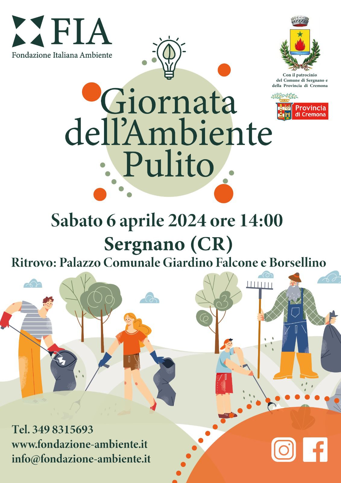 L'Amministrazione Comunale di Sergnano, in collaborazione con la Fondazione Italiana Ambiente ed il patrocinio della Provincia di Cremona, organizza la "Giornata Ecologica": iniziativa di sensibilizzazione ambientale per pulire strade, parchi e aree verdi del paese. L'evento si terrà nella giornata di sabato 06 aprile 2024 con ritrovo presso il Giardino Falcone e Borsellino (Piazzale del Comune) alle ore 14.00. La partecipazione è aperta a tutti i cittadini e alle associazioni locali.
