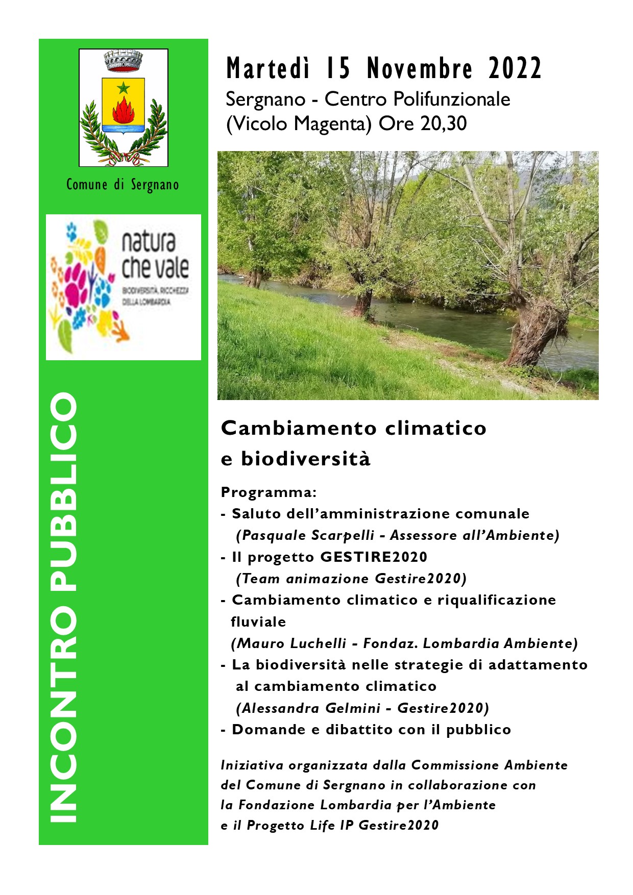 La Commissione Ambiente del Comune di Sergnano, in collaborazione con la Fondazione Lombardia Ambiente e Team Progetto Gestire 2020, organizza un incontro pubblico sul tema: "Cambiamento climatico e biodiversità". Appuntamento per martedì15 novembre 2022 alle ore 20.30 presso il Centro polifunzionale di Vicolo Magenta.