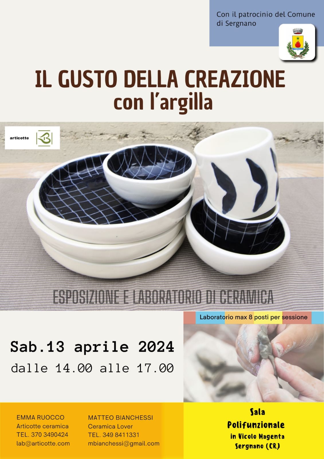 L'associazione Articotte Ceramica, con il patrocinio del Comune di Sergnano, organizza un'esposizione con laboratorio intitolato: "Il gusto della creazione con l'argilla". Appuntamento per la giornata di sabato 13 aprile 2024 dalle ore 14.00 alle 17.00 presso il Centro Polifunzionale di Vicolo Magenta.