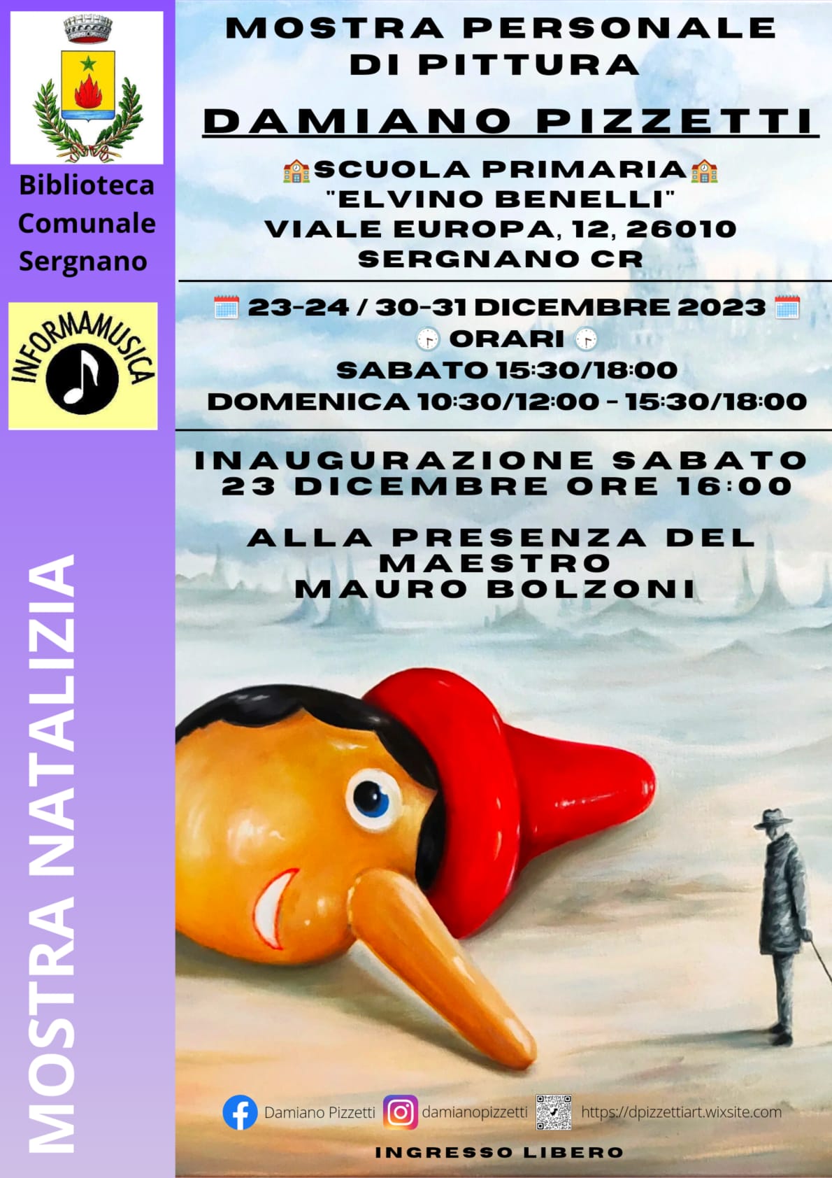 Nelle giornate di sabato 23 e domenica 24 e poi di sabato 30 e domenica 31 dicembre 2023 la Commissione Cultura e Tempo Libero del Comune di Sergnano, con il gentile contributo dell'associazione "Informamusica" organizza la mostra personale di pittura di Damiano Pizzetti presso l'atrio delle scuole elementari E. Benelli (Viale Europa).