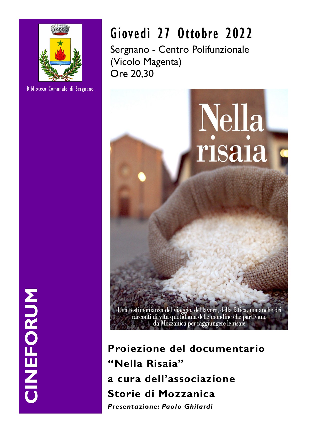 L'Amministrazione Comunale di Sergnano, in collaborazione con l'associazione Storie di Mozzanica, presenta il documentario "Nella Risaia": una testimonianza del viaggio, del lavoro, della fatica e della vita quotidiana delle mondine. Appuntamento giovedì 27 ottobre 2022 alle ore 20,30 presso il centro polifunzionale di Vicolo Magenta.