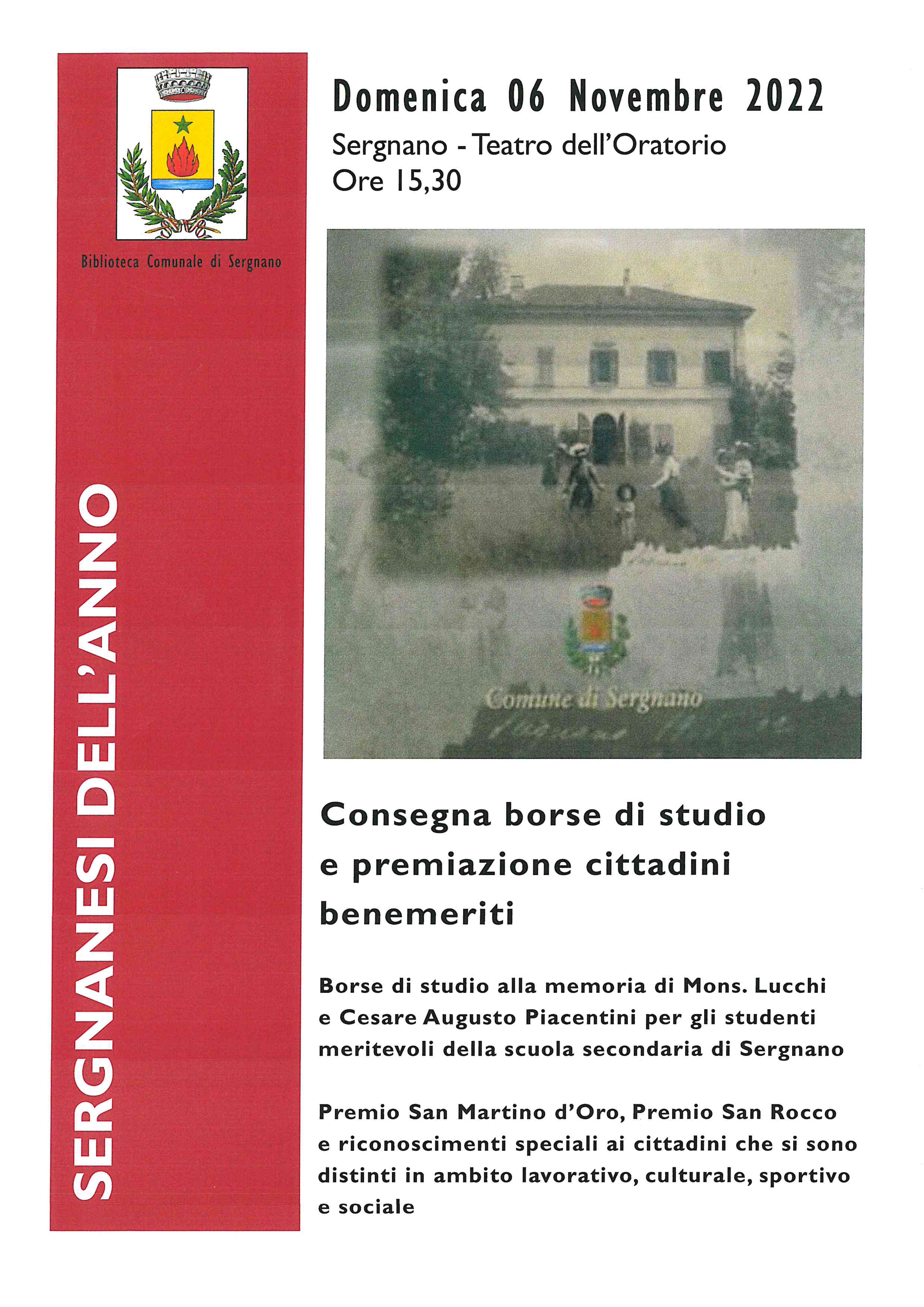 Domenica 6 novembre 2022 si terrà la cerimonia di consegna delle borse di studio e la premiazione dei "Sergnanesi dell'Anno". Appuntamento a partire dalle ore 15.30 presso il Teatro dell'Oratorio in Viale Rimembranze.