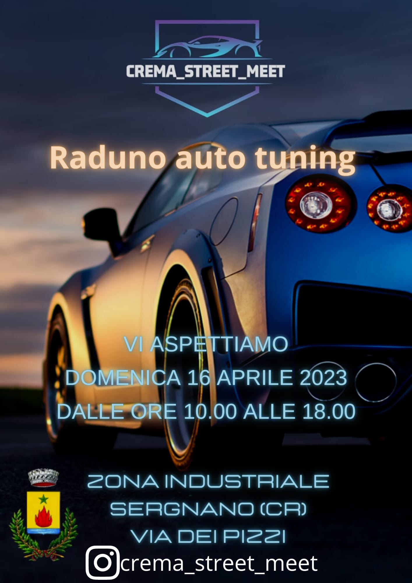 Il gruppo Crema Street Meet, con il patrocinio del Comune di Sergnano, organizza il raduno per "Auto Tuning". Appuntamento domenica 16 aprile 2023 dalle ore 10,00 alle 18,00 in Via dei Pizzi - Zona industriale di Sergnano
