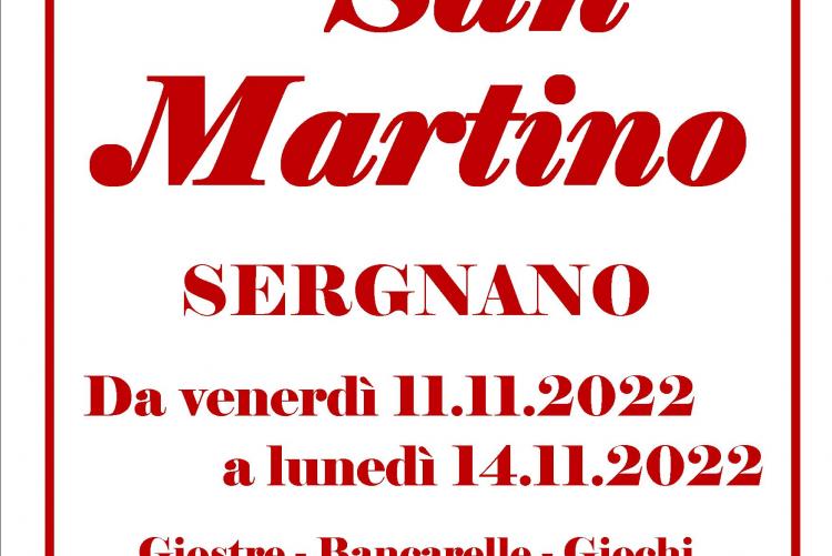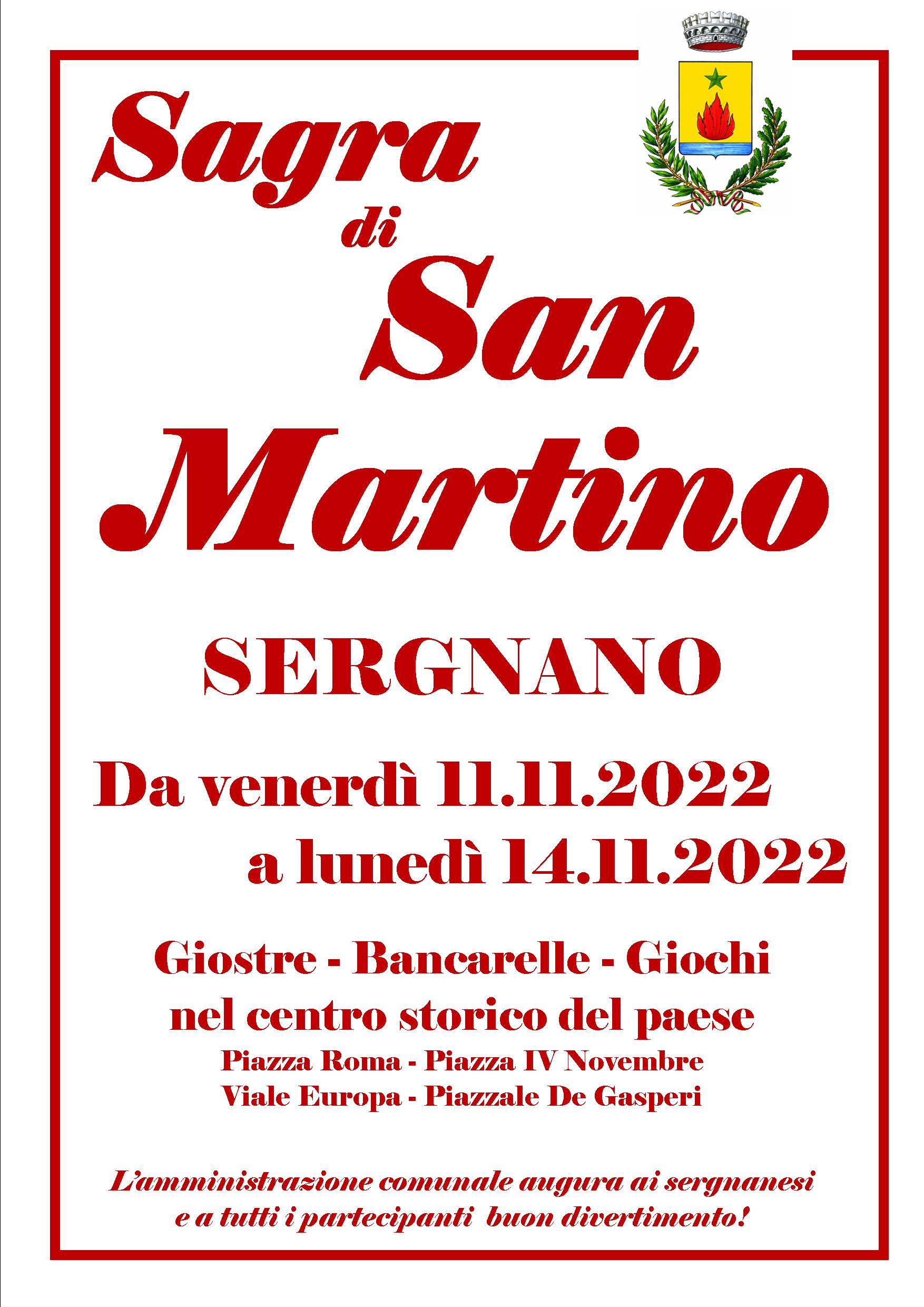 Da venerdì 11 a lunedì 14 novembre 2022 è prevista la tradizionale Sagra patronale di San Martino. La fiera prevede la presenza di numerose attrazioni, giochi e bancarelle commerciali ambulanti nel centro storico del paese. Le modalità di chiusura e limitazione del traffico nella zona interessata all’evento saranno definite dall’Ufficio di Polizia Locale, con apposito provvedimento pubblicato sui canali di comunicazione del Comune di Sergnano.