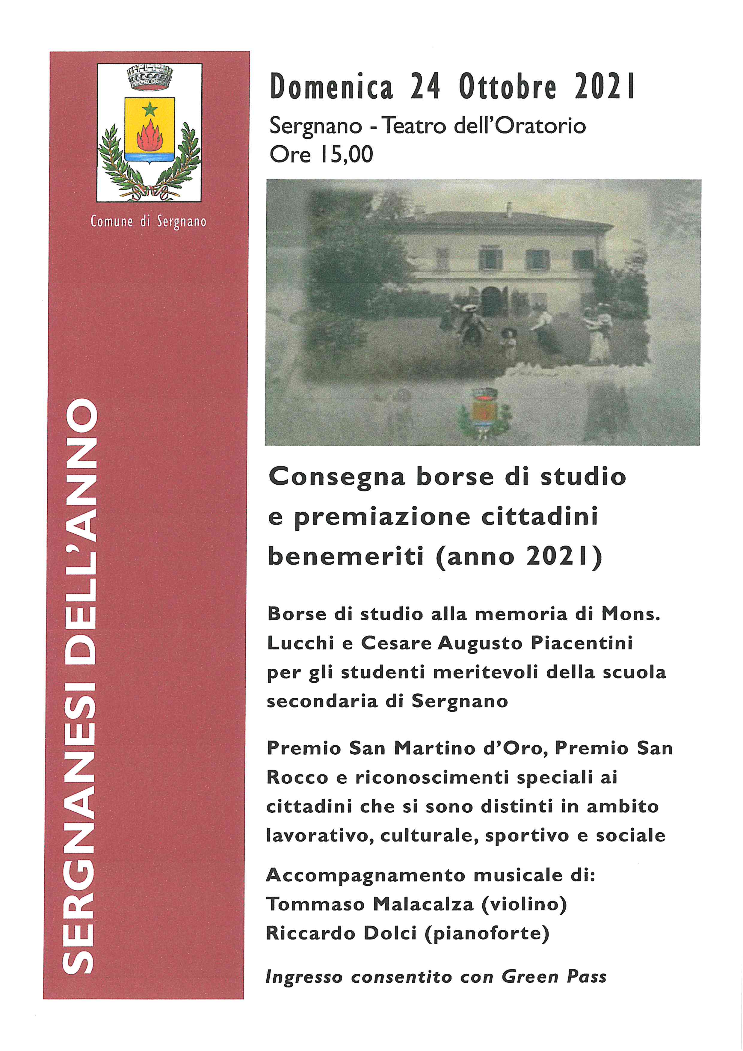 Nella giornata di domenica 24 ottobre 2021 alle ore 15.00 presso il Teatro dell'Oratorio (Sergnano - Viale Rimembranze) l'Amministrazione Comunale organizza la premiazione dei "Sergnanesi dell'anno" con la consegna delle borse di studio agli studenti meritevoli e dei riconoscimenti speciali ai cittadini che si sono distinti in ambito lavorativo, culturale, sportivo e sociale nel corso dell'anno.