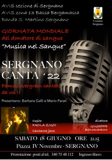 In occasione della Giornata mondiale del donatore del sangue la sezione Avis di Sergnano ed il Corpo bandistico S. Martino Vescovo organizzano il concerto "Sergnano Canta '22". Appuntamento in Piazza IV Novembre sabato 18 giugno 2022 alle ore 21.15: ingresso libero.