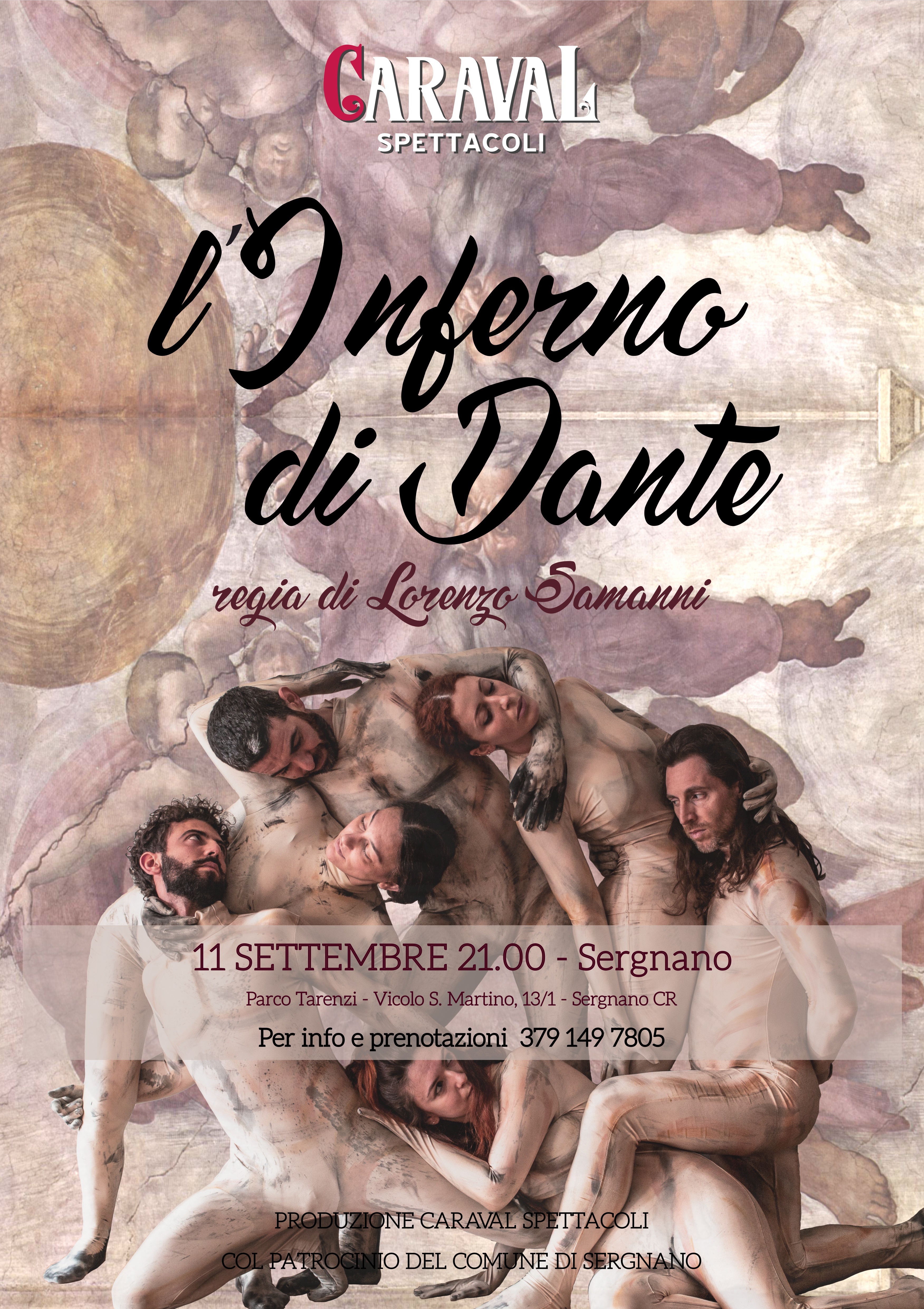 In occasione del 700° anniversario dalla morte del "Sommo Poeta", la compagnia Caraval Spettacoli mette in scena la rappresentazione teatrale "L'Inferno di Dante" con il patrocinio del Comune di Sergnano. Appuntamento sabato 11 settembre 2021 alle ore 21,00 presso il Parco Tarenzi: ingresso gratuito.