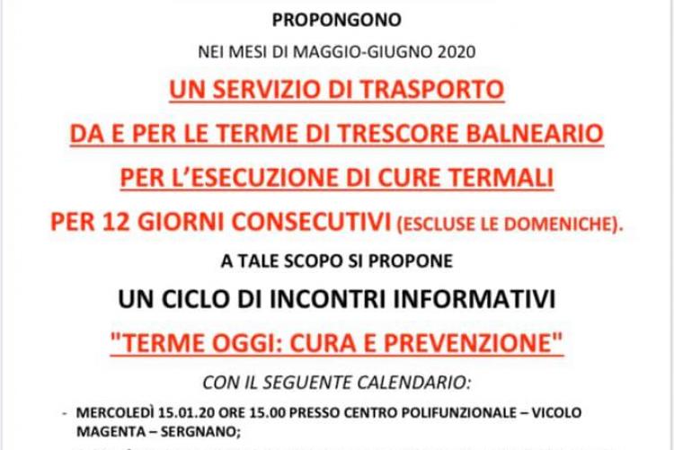 L'amministrazione comunale di Sergnano, in collaborazione con altri Comuni del territorio, propone un servizio di trasporto da e per le terme di Trescore Balneario nei mesi maggio-giugno 2020 per 12 giorni consecutivi (escluse le domeniche).