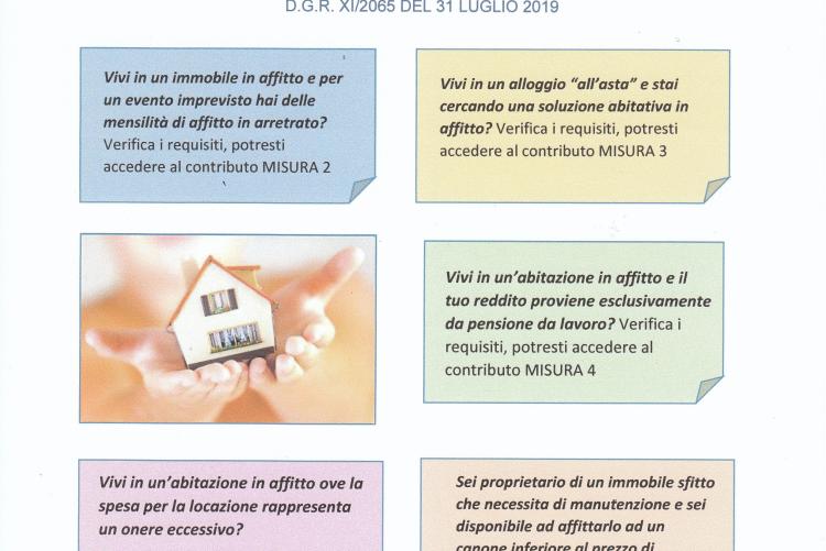 Si informa che informa è disponibile il materiale relativo all’AVVISO PUBBLICO per l’erogazione di contributi volti al contenimento dell’emergenza abitativa e al mantenimento dell’alloggio in locazione (D.G.R. XI/2065 del 31 luglio 2019):